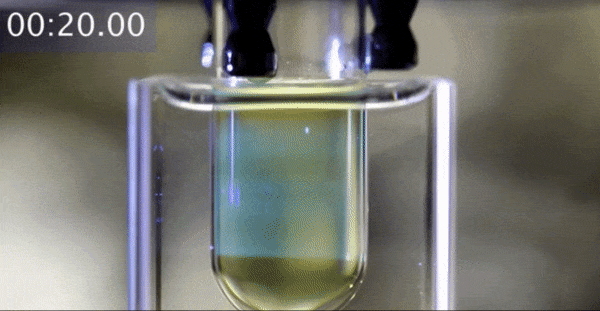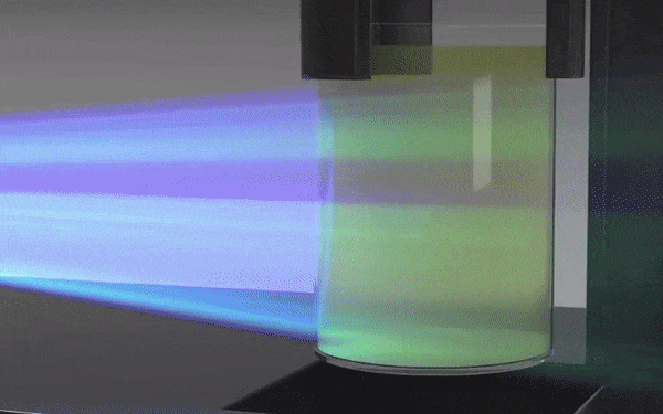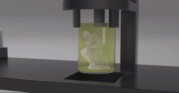 硫醇烯树脂是适用于体积3D打印的一类材料,它们可与LLNL(Lawrence Livermore National Laboratory)的体积增材制造(VAM)技术一起使用,包括计算机轴向光刻(CAL,computed axial lithograph),该技术通过将三维图案化的光束投射到树脂小瓶中来产生物体。当光线将液体树脂在体积中的所需位置固化为固体时,样品瓶旋转,然后将未固化的树脂排干,在短短几秒钟内将3D对象留下(步骤如下动图)。