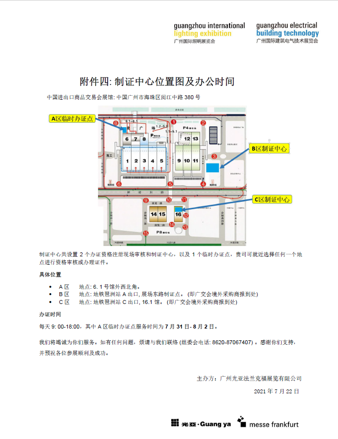 B区参展商报到处:珠江散步道12-1柜台; 领证处:12-2柜台
