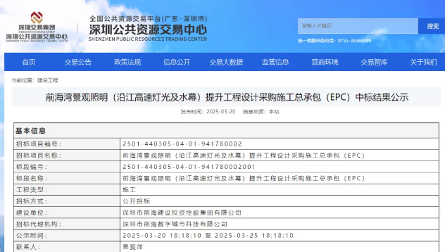 3月20日,深圳公共资源交易中心发布前海湾景观照明(沿江高速灯光及水幕)提升工程设计采购施工总承包(EPC)中标结果,确认深圳市明之辉智慧科技有限公司/福建永泽照明有限公司为中标单位,中标价6947.422456万元,工期290天。