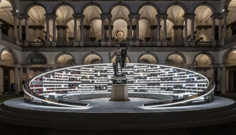 为了庆祝欧洲光影艺术节的盛大回归,米兰国际家具展特别邀请了英国著名布景设计师 Es Devlin,在布雷拉画廊的 17 世纪 Cortile d'Onore 庭院内精心打造了一件名为《Library of Light》的巨型艺术装置。