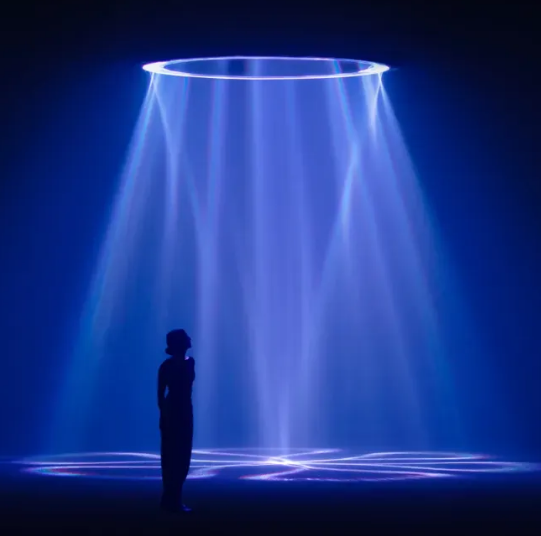 为了实现这一目标,Turczan 及其团队开发了一系列定制的光学设备,能够高度集中地投射光线,精准控制光束,使其不会扩散、散射或模糊。“想象一下一个直径六英尺、高十英尺的巨大光管,它仿佛在空间中勾勒出了一道无形的边界,”艺术家说道,“我们试图让光线本身具有一种物体般的质感。”