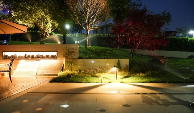 景观照明的目的是为了突出庭院中的景观元素,营造美观的夜景效果。它可以照亮庭院中的树木、雕塑、水景等。例如,对于一棵高大的树木,可以通过在树干周围安装投光灯,将光线向上投射,使树木在夜晚呈现出独特的光影效果,仿佛它在夜空中伸展着枝叶。