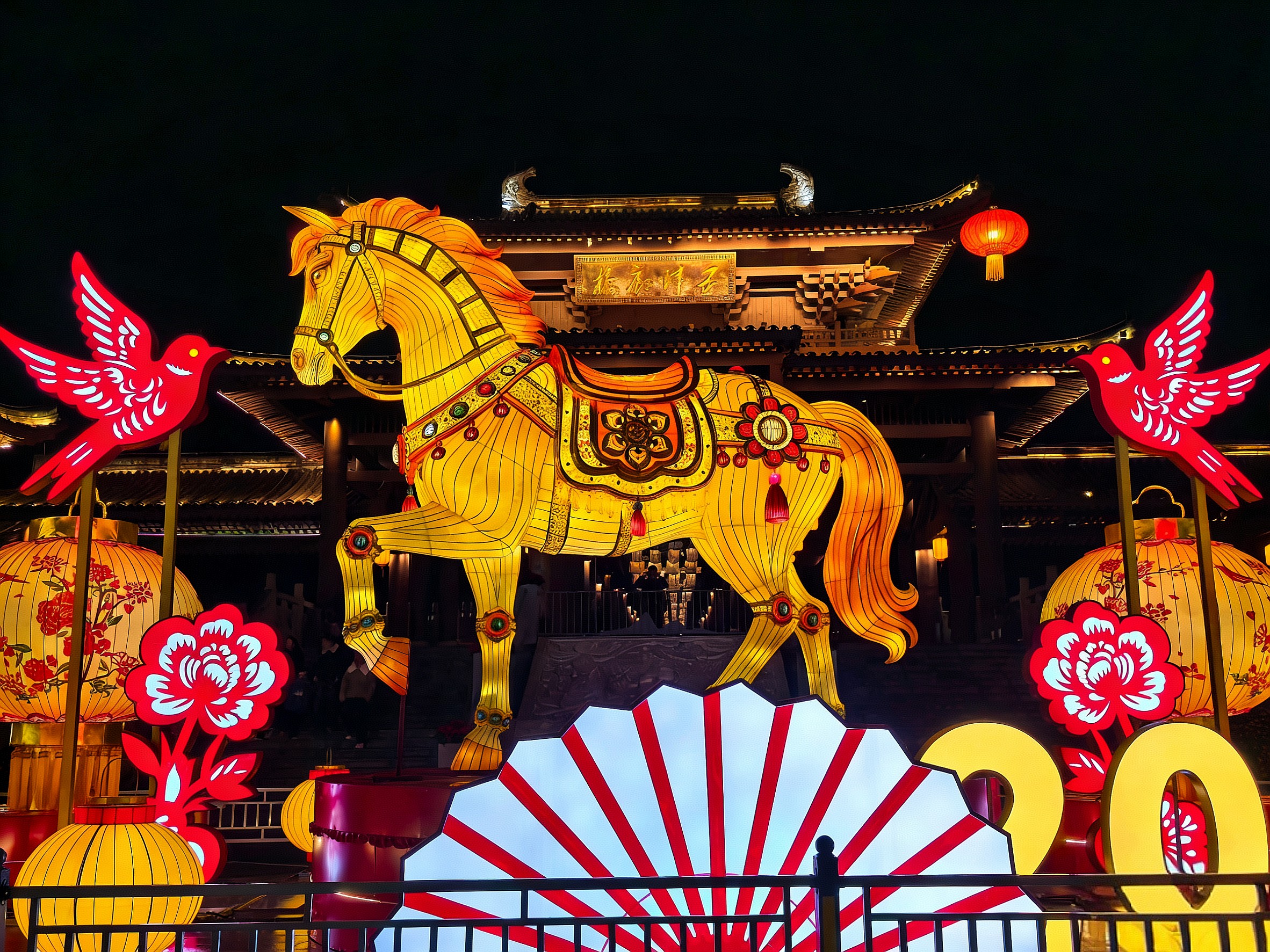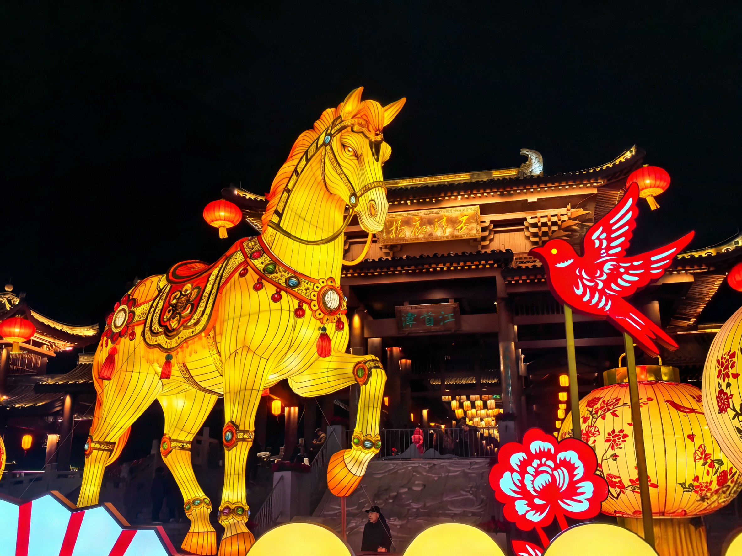 位于五津廊桥广场的马年主题彩灯在夜色中光彩夺目!围绕着传统元素如雀鸟、折扇、宫灯等之上,一匹鎏金骏马凌空跃动,吸引了过往游人驻足拍照留念!