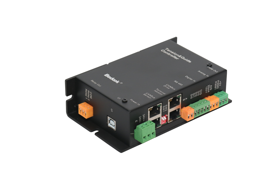 张力传感器实时检测原料张力大小,发送给控制器,控制器比较目标张力和实际张力大小,进行PID运算后,输出一个电流驱动料卷上磁粉刹车的刹车力。以上闭环控制过程持续不断进行,实现卷材张力的自动控制。